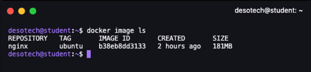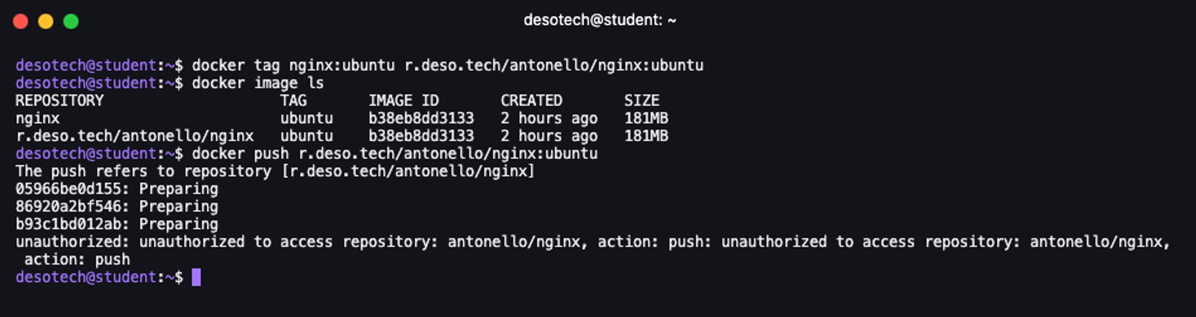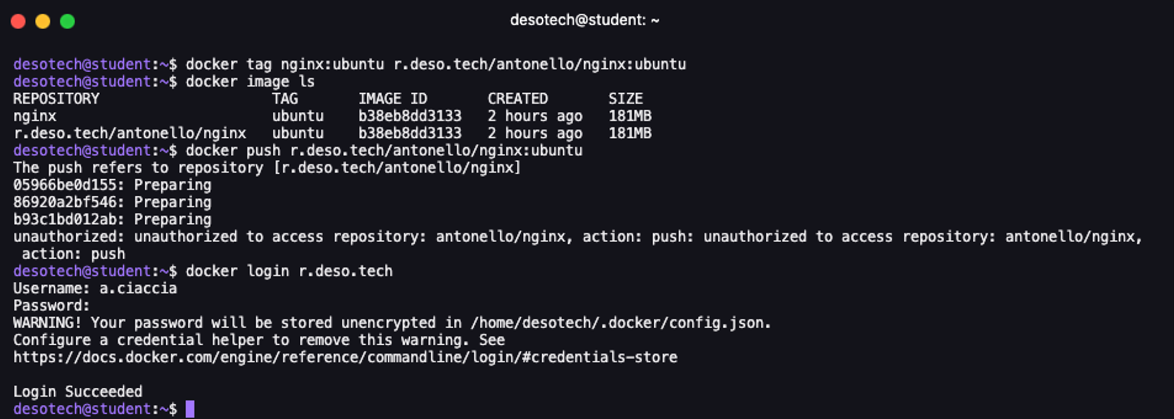 Attualmente l’immagine di cui desideriamo fare il push è r.deso.tech/antonello/nginx:ubuntu