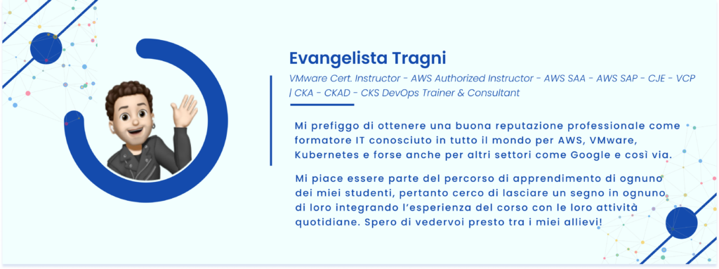 Mi prefiggo di ottenere una buona reputazione professionale come formatore IT conosciuto in tutto il mondo per AWS, VMware, Kubernetes e forse anche per altri settori come Google e cosi via. Mi piace essere parte del percorso di apprendimento di ognuno dei miei studenti, pertanto cerco di lasciare un segno in ognuno di loro integrando l’esperienza del corso con le loro attivita quotidiane. Spero di vedervi presto tra i miei allievi!