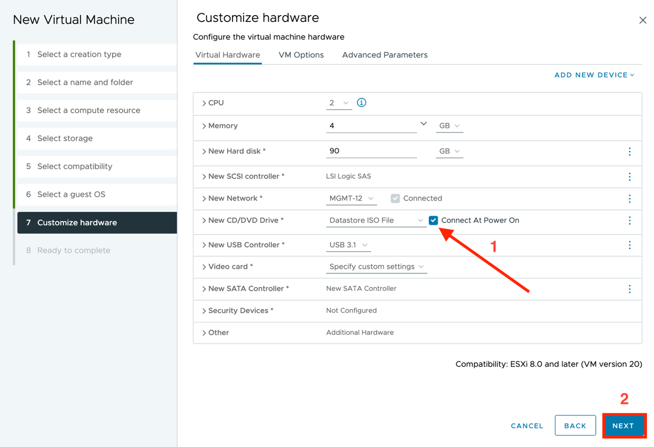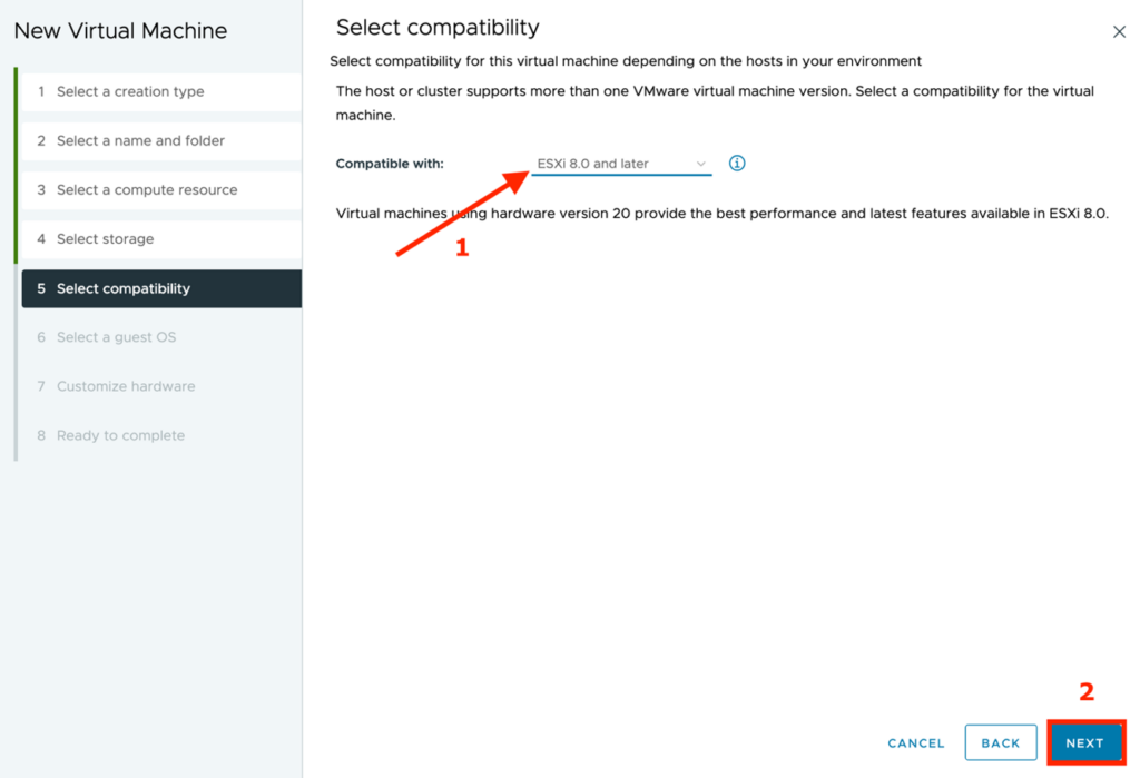 Una volta selezionato lo storage, ci verrà chiesto di selezionare con quale versione di ESXi sarà compatibile la nostra VM. Avendo un ambiente totalmente aggiornato alla versione 8, selezioniamo “ESXi 8.0 and later”. Ogni versione di ESXi ha una hardware version associata, versione 20 per ESXi 8.0. L’hardware version determina le funzionalità hardware supportate dalle VM.