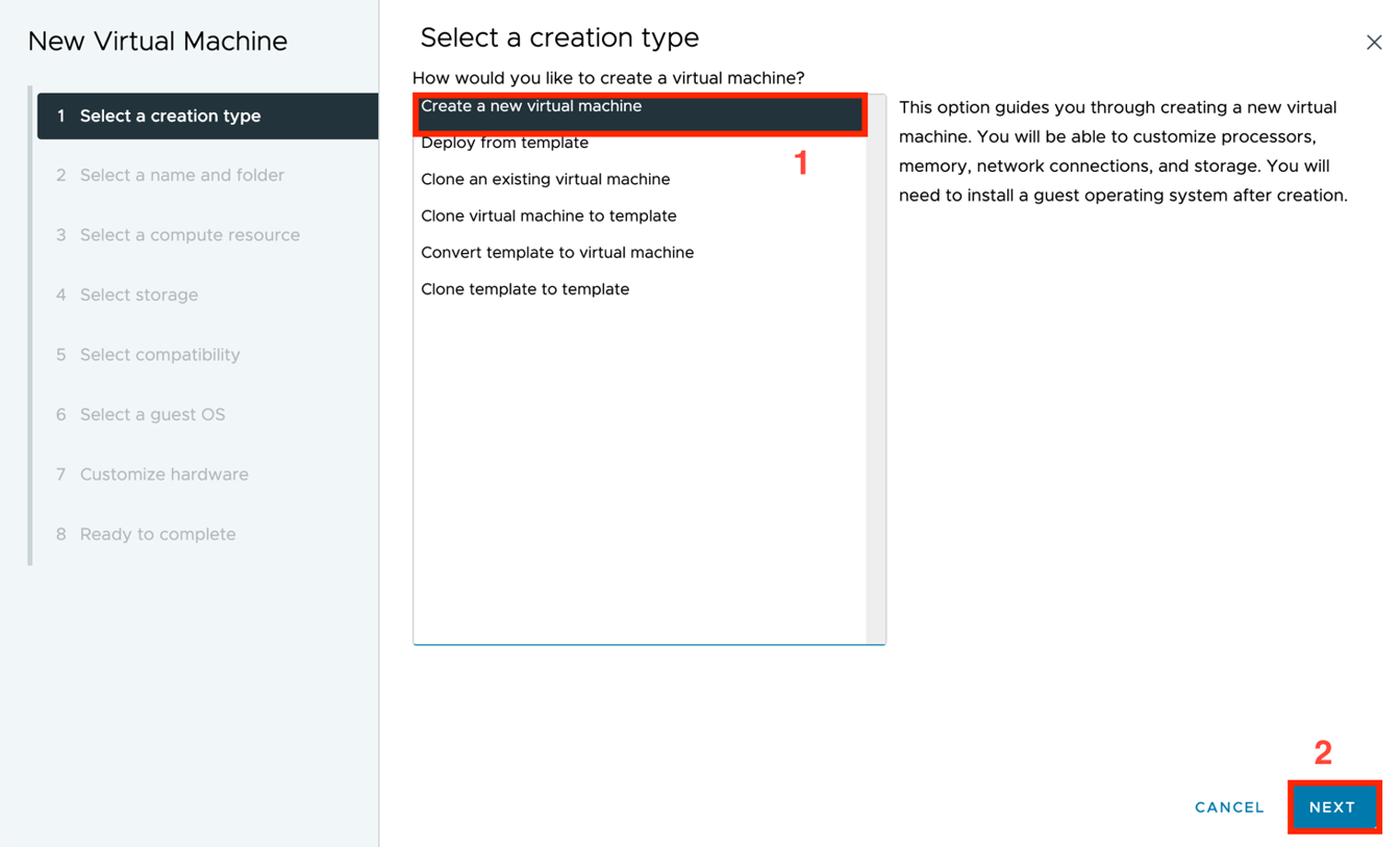 Si aprirà, a questo punto, la finestra di creazione guidata di una macchina virtuale. Come puoi vedere, ci sono vari modi per creare una VM in vSphere 8, quello su cui ci concentreremo oggi è la cosiddetta creazione from scratch (da zero). Selezioniamo quindi “Create a new virtual machine”.
