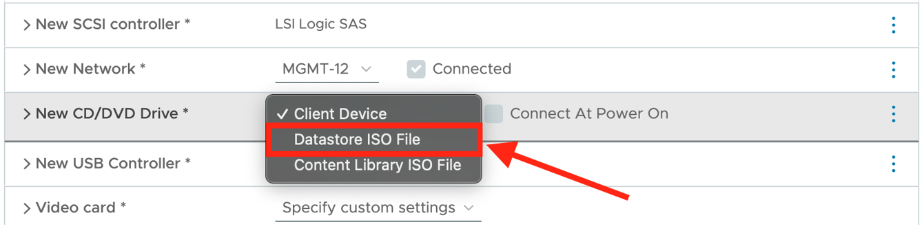Per poter installare il sistema operativo particolarmente utile è la possibilità di montare un file ISO come dispositivo CD/DVD. Possiamo quindi scaricare la ISO dal sito del vendor, caricarlo su un datastore e montarlo sulla macchina virtuale. Clicchiamo su “Client Device” a fianco di “New CD/DVD Drive” e selezioniamo “Datastore ISO file”: