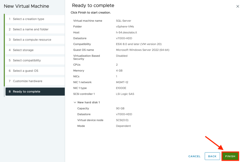 Infine, troviamo la pagina “Ready to complete” in cui vSphere ci dà la possibilità di visualizzare quanto configurato negli step precedenti. Se siamo soddisfatti clicchiamo “Finish”, altrimenti possiamo tornare indietro e modificare i vari parametri.