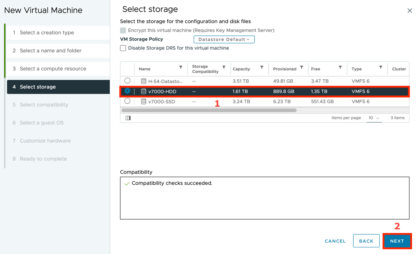 Selezioniamo il datastore, lo storage, dove verranno scritti i file della macchina virtuale. Di datastore ne possiamo creare ed utilizzare di vari tipi all’interno di vSphere 8, quello utilizzato nell’esempio è il Virtual Machine File System (VMFS) alla versione 6, l’ultima disponibile.