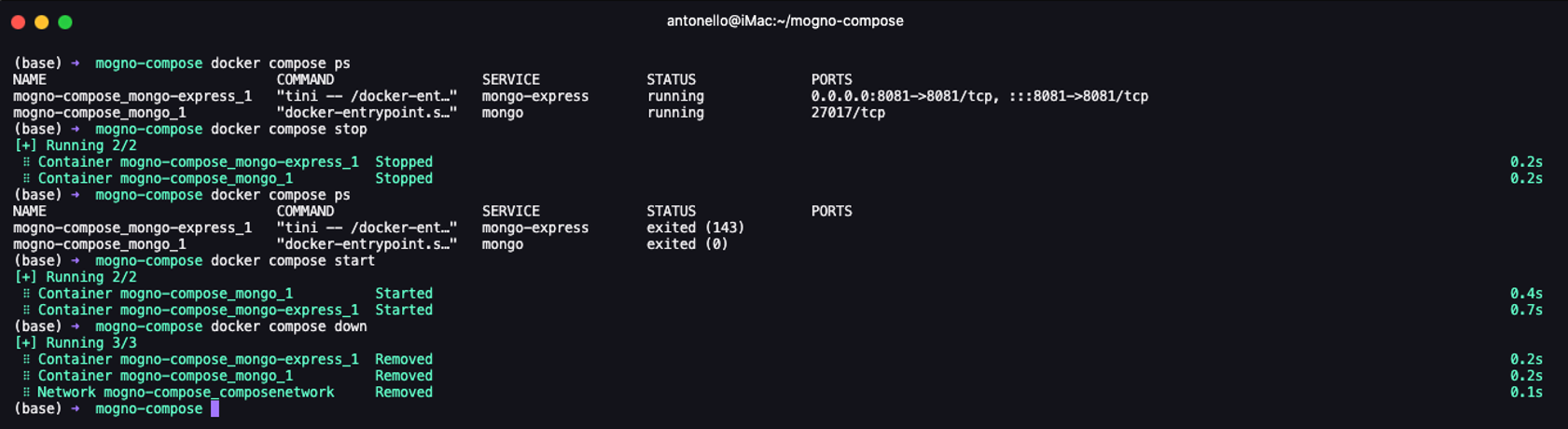 Se poi abbiamo esigenza di fare pulizia oltre a stoppare il tutto possiamo eseguire il comando docker compose down .