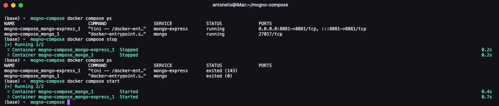 Anche se il file Docker Compose può diventare più complesso e con più servizi, questo non incide sulla facilità di creazione e gestione dell’ambiente. Se vogliamo mettere in pausa l’ambiente possiamo semplicemente eseguire il comando docker compose stop. Per riprendere basta dare il comando docker compose start .